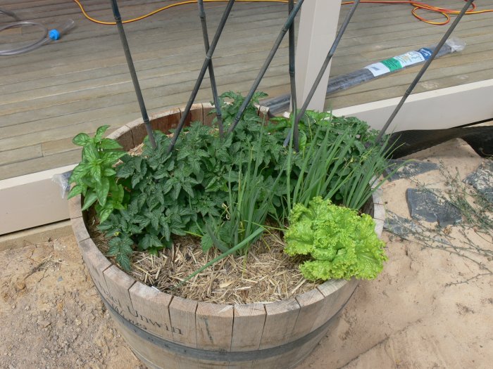 Basil, Cherry Tomatoes, Spring Onion, Lettuce, and Italian parsley growing behind.